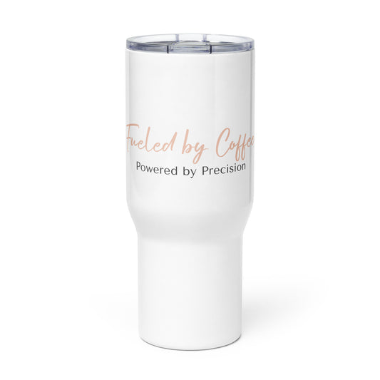 Travel mug with a handle with sign "Fueled with Coffee, Powered by Precision."