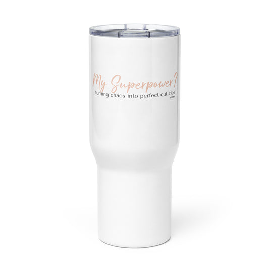 Travel mug with a handle with sign "My superpower? Turning chaos into perfect cuticles"